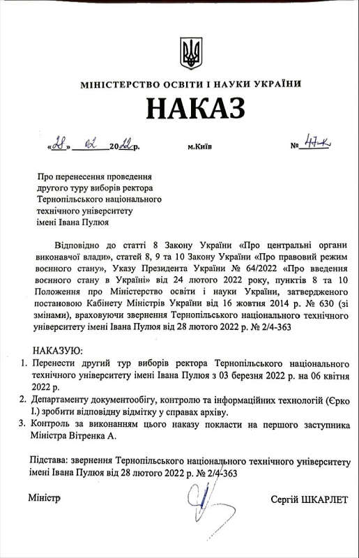 Другий тур виборів ректора перенесено Наказом Міністерства освіти і науки України № 47-К від 28.02.2022 на 06 квітня 2022 р.