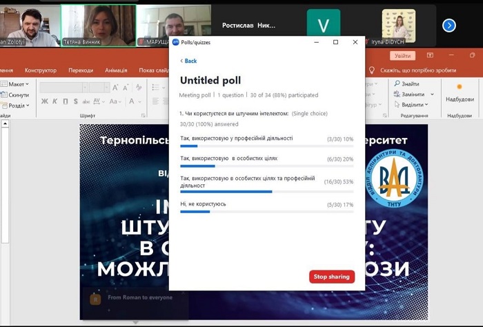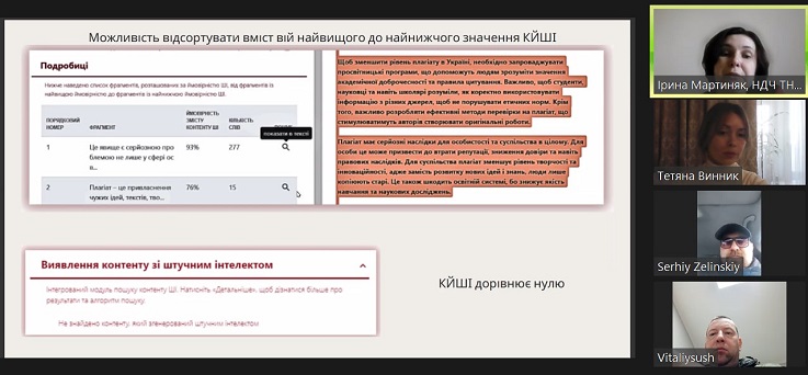 Учасники вебінару обговорили можливості та перспективи застосування ШІ у професійній діяльності, зокрема у наукових дослідженнях та педагогічній практиці, наголосивши при цьому на необхідності дотримання академічної доброчесності та продемонструвавши сервіси виявлення контенту ШІ, окреслили виклики та загрози, поділилися досвідом роботи з інструментами штучного інтелекту.