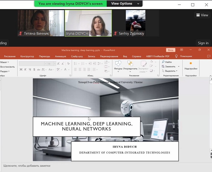 Проректор з наукової роботи, д.т.н., професор Павло МАРУЩАК закцентував увагу на важливості та актуальності такої зустрічі. Доповідачами на вебінарі були: Тетяна ВИННИК - завідувачка відділу аспірантури та докторантури, к.е.н., доцентка; Ірина ДІДИЧ - доцентка кафедри компʼютерно-інтегрованих технологій, PhD University Clermont Auvergne, France, 2022; Ірина МАРТИНЯК - начальниця науково-дослідної частини, к.е.н., доцентка; Андрій СТАНЬКО - старший викладач кафедри компʼютерно-інтегрованих технологій, PhD , ТНТУ, 2024.