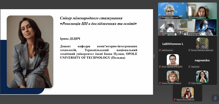 За сприянням докторки економічних наук, професорки кафедри управління інноваційною діяльністю та сферою послуг, членкині Східноєвропейської асоціації вчених (Варшава, Польща) Людмили ЗАВІДНОЇ, в якості спікерки була запрошена викладачка кафедри комп’ютерно-інтегрованих технологій — Ірина ДІДИЧ, докторка філософії (PhD) з прикладної математики, доцентка ТНТУ, партнер OPOLE UNIVERSITY OF TECHNOLOGY (Польща).