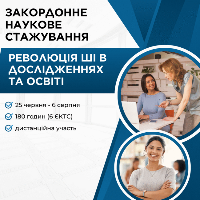 З 26 червня розпочалося міжнародне наукове стажування «Революція ШІ в дослідженнях та освіті: оволодіння нейронними мережами, машинним навчанням та етичними інноваціями». Стажування проводиться дистанційно з 26 червня по 06 серпня 2025 року, тривалість 180 годин (6 кредитів ECTS).