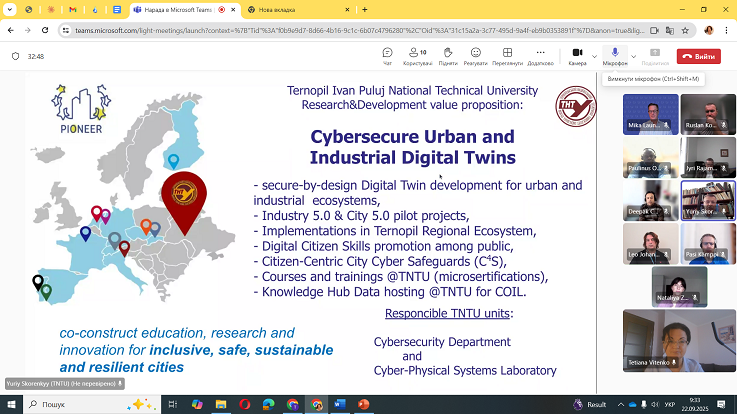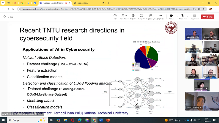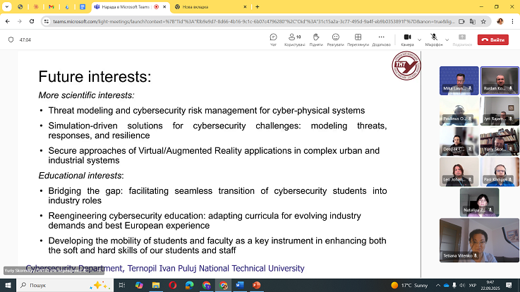 Партнери представили напрями наукової й освітньої співпраці, поділилися досвідом підготовки бакалаврів і магістрів за спеціальністю «Кібербезпека», а також практиками взаємодії з міжнародними партнерами. Було визначено можливі напрями подальшої роботи, зокрема інтеграцію європейського досвіду в освітній процес ТНТУ, та обговорено перспективи розвитку академічної мобільності між університетами.