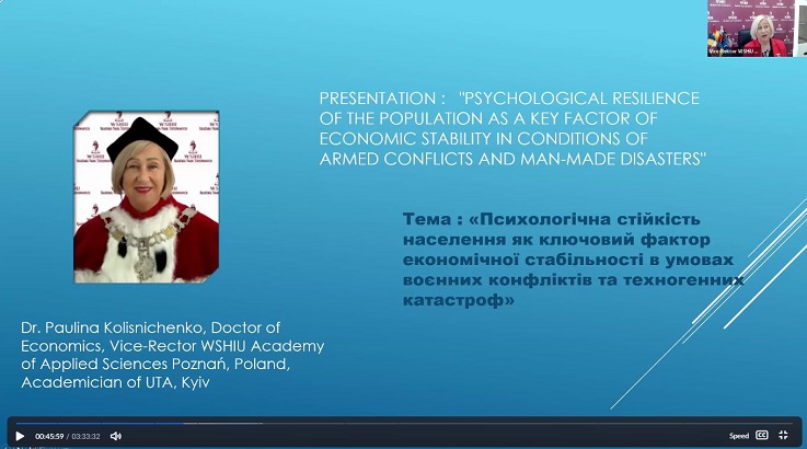 Змістовною та концептуально важливою стала доповідь Пауліни КОЛІСНІЧЕНКО (проректор WSHIU Академія прикладних наук, м. Познань, Польща) «Психологічна стійкість населення як ключовий фактор економічної стабільності в умовах воєнних конфліктів та техногенних катастроф», у якій авторка переконливо довела взаємозв’язок між психологічною витривалістю суспільства та його економічною стабільністю в кризових умовах.