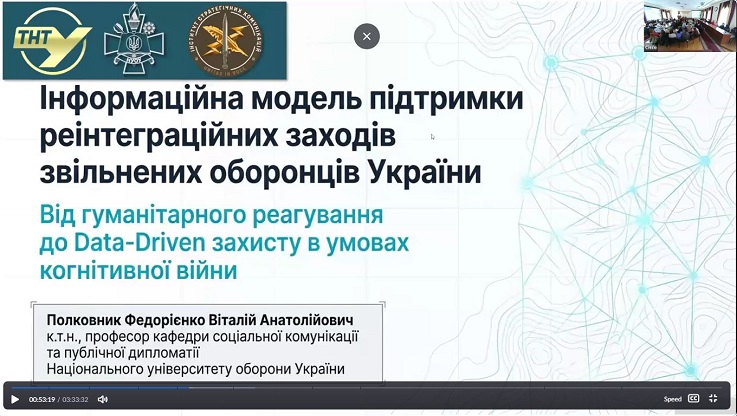 Представник Національного університету оборони України Віталій ФЕДОРІЄНКО представив доповідь «Інформаційна модель підтримки реінтеграційних заходів звільнених оборонців України», у якій було запропоновано сучасні підходи до інформаційного супроводу процесів реінтеграції військовослужбовців, що повернулися з полону або бойових дій.