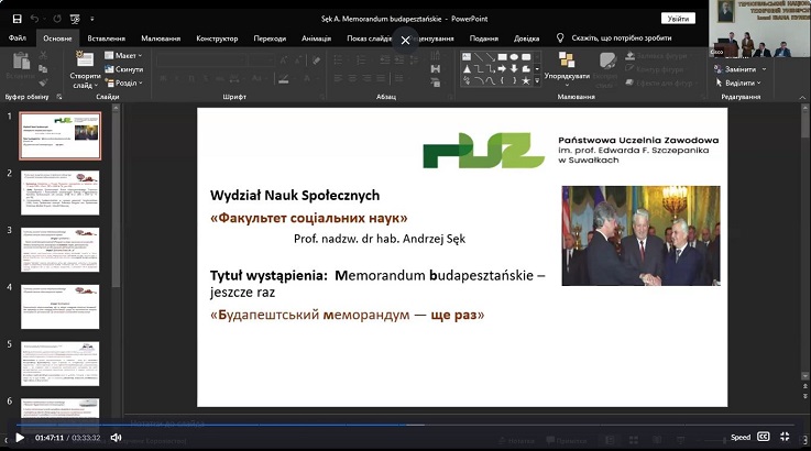 Andrzej SĘK (Wydziału Nauk Społecznych Państwowa Uczelnia Zawodowa im. prof. Edwarda F. Szczepanika w Suwałkach, Polska) у доповіді «Memorandum budapesztańskie, korzyści i straty» порушив фундаментальні питання міжнародних безпекових гарантій, цивільного захисту та їхнього значення для виживання держав у кризових умовах.
