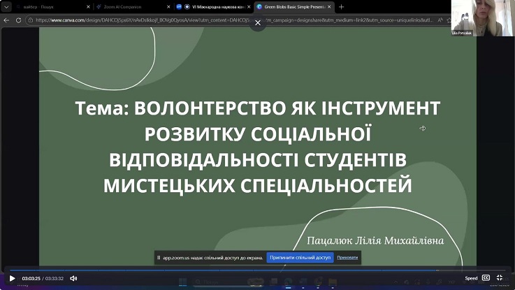 Лілія ПАЦАЛЮК (Тернопільський національний педагогічний університет імені Володимира Гнатюка, ГО "Країна рівності і правди", Україна) у доповіді «Волонтерство як інструмент розвитку соціальної відповідальності студентів мистецьких спеціальностей» акцентувала увагу на виховному потенціалі волонтерської діяльності та її ролі у формуванні громадянської свідомості молоді.
