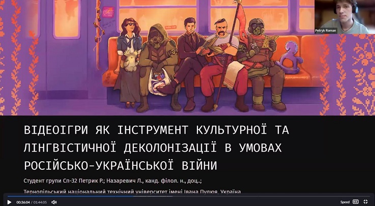 Леся НАЗАРЕВИЧ та Роман ПЕТРИК у дослідженні «Відеоігри як інструмент культурної та лінгвістичної деколонізації в умовах російсько-української війни» представили оригінальне та сучасне бачення ролі цифрових медіа у формуванні національної ідентичності. Доповідь вирізнялася новизною підходу та міждисциплінарністю, поєднуючи гуманітарні та технологічні аспекти.